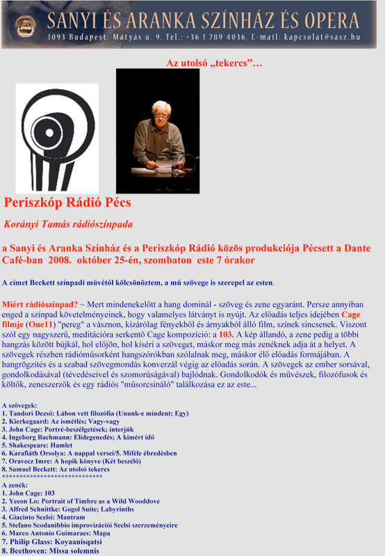 Programok a nap során: 0-24h Események - Pécs - Periszkóp Rádió stúdió (7621 Pécs, Mátyás kir. u. 2. - Pécsbelváros fm97.1) • 0h-10h rádiós dj-k: 0-1h youry, 1-2h sowjet, 2-3h szabi, 3-4h mate, 4-5h m\'ill, 5-6h knives, 6-10h steiner ![]() • Ezt követően a nap eseményeit közvetítjük 10h30-10h33 Pécs - Jókai tér ![]() 10-24h Események - Pécs - Dante Café (7621 Pécs, Janus Pannonius u. 11.) • 10h a szabad frekvencián sugárzó jeladó elindítása ![]() • 10-11h beszélgetések, bejelentő levél és nyilatkozat megfogalmazása, 10h25-kor átvonulás a Jókai térre, majd 10h40-kor vissza • 11-13h között szakmai beszélgetéseket tartunk, melyek témakörei: a szabad frekvenciák sorsa a digitális átállás után, valamint a frekvenciamoratórium eddigi eredményei. Résztvevő szakemberek: dr. Timár János (testületi tag, ORTT), Bajomi-Lázár Péter (médiaszakértő, Zsigmond Király Főiskola), dr. Komlódi András (Társaság a Közérdekű Adatokért), SzaRáMaSzer és rádiós szervezetek képviselői. Moderátor: Peták Péter (Remete Rádió, Istenkúti Közösségért Egyesület). ![]() • 14-17h szakmai beszélgetések, témakörök: pécsi helyi rádió indítása, szabad frekvenciák a szomszéd országokban, nyilatkozat kiadása • benne: filmvetítés - A mi kis rádiónk (2007, dokumentumfilm, 51', r. Litauszki János) • 17-19h Weber Kristóf zenei programja ![]() • 19-20h mc dózi & dj petya (SuppaSoul) - freestyle ![]() • 20-21h Korányi Tamás rádiószínháza ![]() • 20h- koncertek: Doktor Kondor, Drugi Program, rádiós dj-k ![]() 10-22h Események - Székesfehérvár - Bőrgyár (8000 Székesfehérvár, Tobak u. 27. - valamint éterben) Beszélgetések, zenei programok, pontos program: • 10h sajtófigyelo a coil-al • 11h - a hangadó rádió - 1992. március 15-i napjáról beszélgetés Zölddel - zene: Sigur Rós • 12h - riportereink jelentik + orosz kortárs előadók • 13h - jó ebédhez válogat - pendrive dj: korai elektronikus hangszerek szólalnak meg • 14h - úgyis mindenki alszik - hallgassunk kicsit városi zajokat • 15h - el se hinnéd - ismert előadók - különös, ismeretlen felvételei • 16h - válogatás a magyar kortárs elektronikus zene felvételeiből • 17h - ötórai tea - pendrive dj-vel • 18h - fehérvári elektronikus előadók felvételei a múltból (terra rossa; fnlo; the corporation; discrate by) • 19h - fehérvári fiatal zenekarok demólemezei - Klecska Marci válogatásában • 20h - vendégeink: elf; dexter • 22h - műsorzárás Egyéb info a Bőrke oldalon. ![]() 10-22h "Adózzunk!" - Budapest (Szövetség u. 39) • 19h Lumek • 20h Négykézláb Soha • 21h Rovar 17 Programok a megelőző napok során: Október 23. 21h- Improv Est Szeged, Grand Café (Szeged, Deák Ferenc u. 18. II. emelet) az Improv.hu online zenei magazin és a Rádió MI {FM 89.9 MHz} szervezésében 21.00 Trio Free Radio {H} ![]() 21.30 triPhaze {D} ![]() 22.00 Goh Lee Kwang {MAL} ![]() 23.00 Jamsession ![]() Október 24. 16h- PTE Művészeti Kar (7624 Pécs, Damjanich u. 30.) A szakmai nap előtt október 24-én, pénteken 16 órától a program szervezői a PTE Művészeti Kar Mediális Művészetek Intézetében szakmai képzéseket tartanak. Előzetes regisztráció az alul jelzett email címen lehetséges! - Frekvenciagazdálkodás általános kérdései, definíciók, alapvetések, magyar helyzet, nemzetközi kitekintés (Előadó: Hargitai Henrik) és ![]() - A lengyelországi frekvenciagazdálkodás anomáliái (Előadó: Marcin Lewandowski (Krakkó, Radio Art)) ![]() - Kalózrádiók ma, mi látszik a SIMONból (az NHH új automatikus bemérőrendszere) a kalózok oldaláról, mit csinálnak a DX-erek (hullámvadászok), mi az a freeband? ![]() - Wi-Fi és egyéb alternatív kommunikációs csatornák, használatuk szabályozása, lehetőségek (Előadó: tárgyalás alatt) Technikai információk: Megközelíthetőség: a térképek a helyszínek neveire kattintva érhetők el. Pécsett az egyes helyszínek között a frekvenciaszóró személyautók segítenek. Szállás lehetőségek: A program résztvevői számára a Kodály Kollégiumban (7624 Pécs, Kodály u. 20/A T/F: (72) 326-611) szállást foglalunk. Ennek ára 2700 ft/fő/éjszaka. A szállás a SzaRáMaSzer tagrádiókból érkező közreműködők számára a szervezet által megtéríttetik. Egyéb infó: Koordinátor: Kovács Balázs (email: xrc@periszkopradio.hu, tel. 20-2331867) A rendezvényt támogatják: NCA, ORTT Alap (szakmai előadások és viták), NKA (kísérleti zenei akciók) |