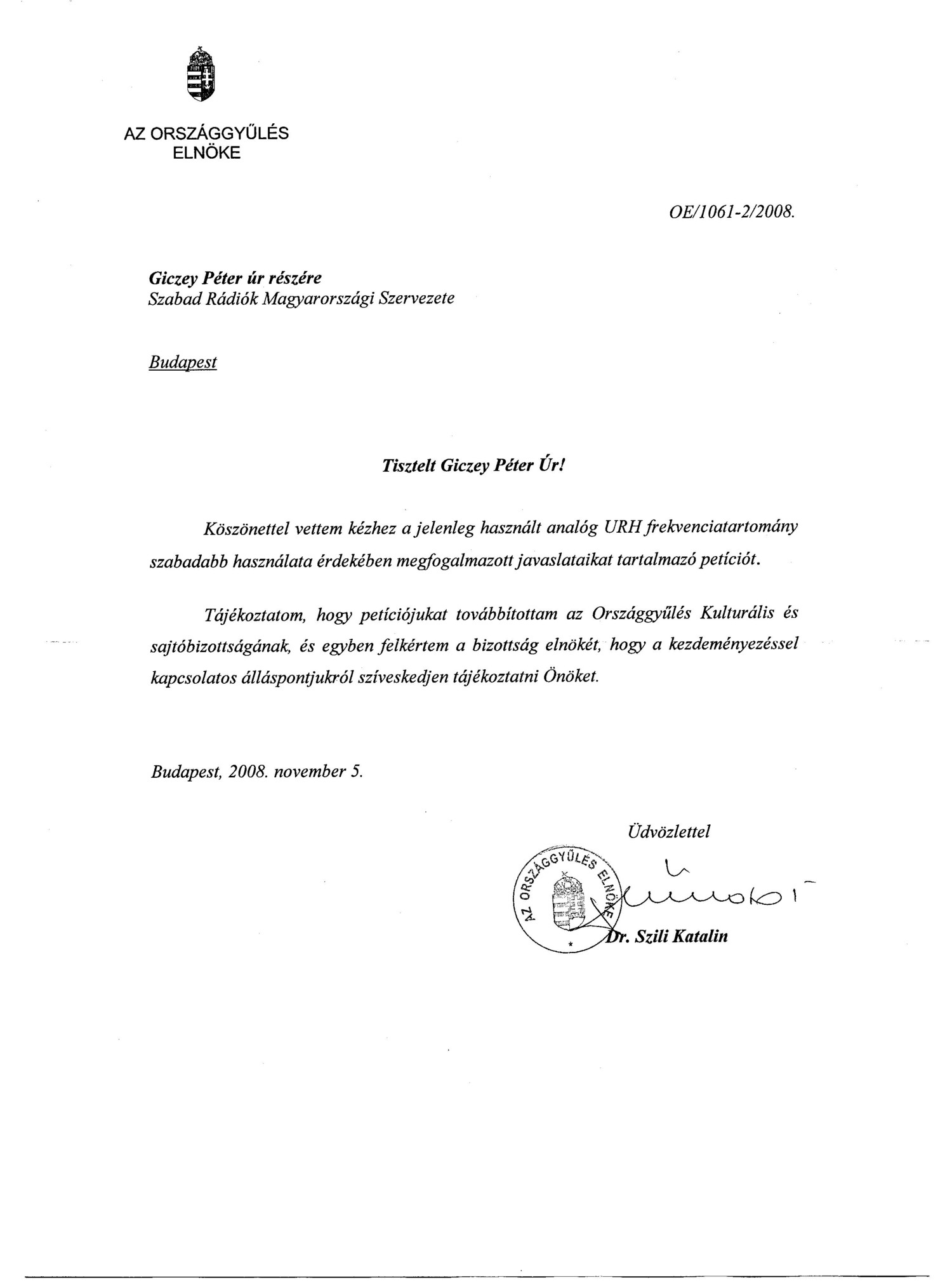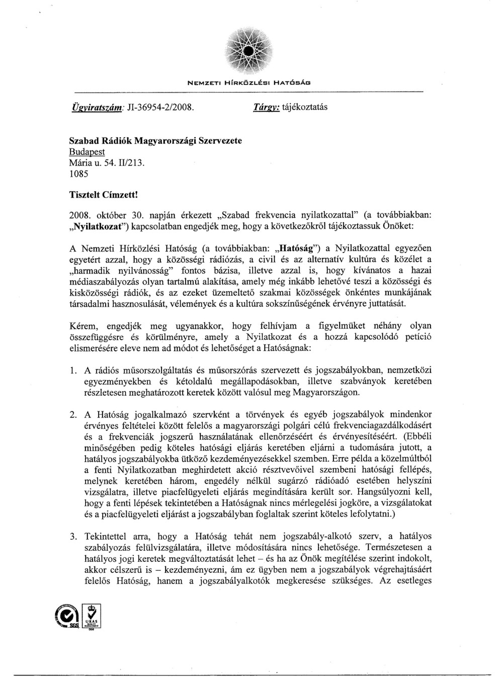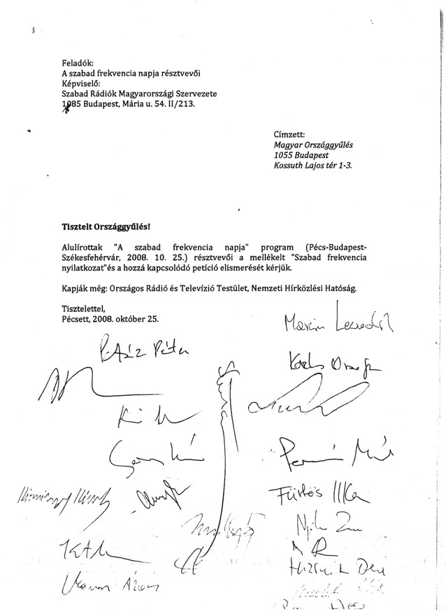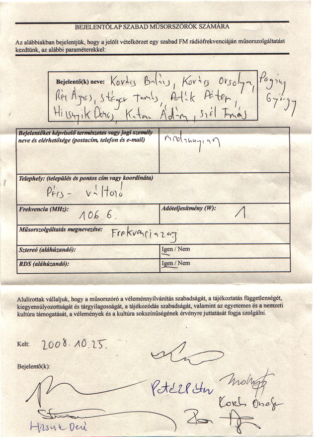 Szabad frekvencia nyilatkozat Kelt: 2008. október 25-én, szombaton, a szabad frekvencia napján |
