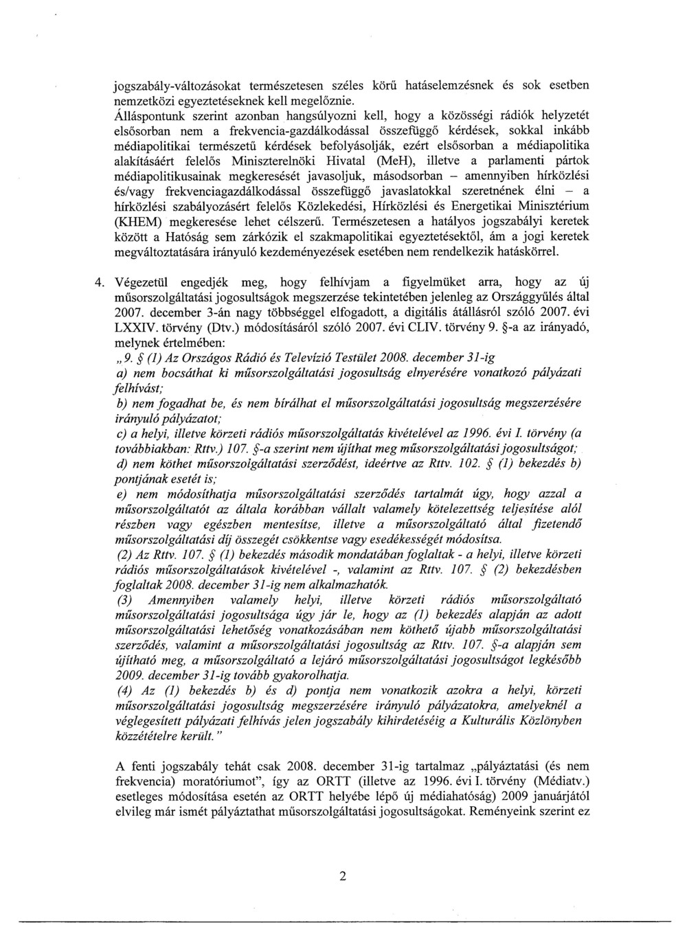 2. egy, országosan kijelölt frekvenciasávon belül teljesítmény szerint korlátozott (1W) keretek között fokozatosan legyen lehetséges a szabad frekvenciahasználat, ugyanakkor a meglévő adók zavarásának elkerülése végett bejelentési kötelezettség védje a már létező rádióadók vételkörzetét. Mindamellett kezdeményezzük a kisközösségi rádiók adóteljesítményének növelését az egyes rádiók pályázatában megfogalmazott célközönség elérése érdekében a 2003. 07. 16-án kelt pályázati felhívásban szereplő maximális 10W határértéken belül. A fentiek